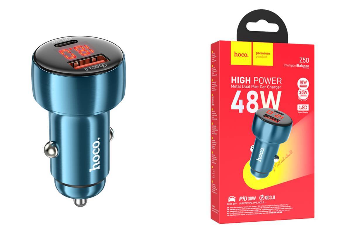 Автомобильное зарядное устройство АЗУ USB + USB-C HOCO Z50 Leader 48W PD30W + QC3.0 (синий)