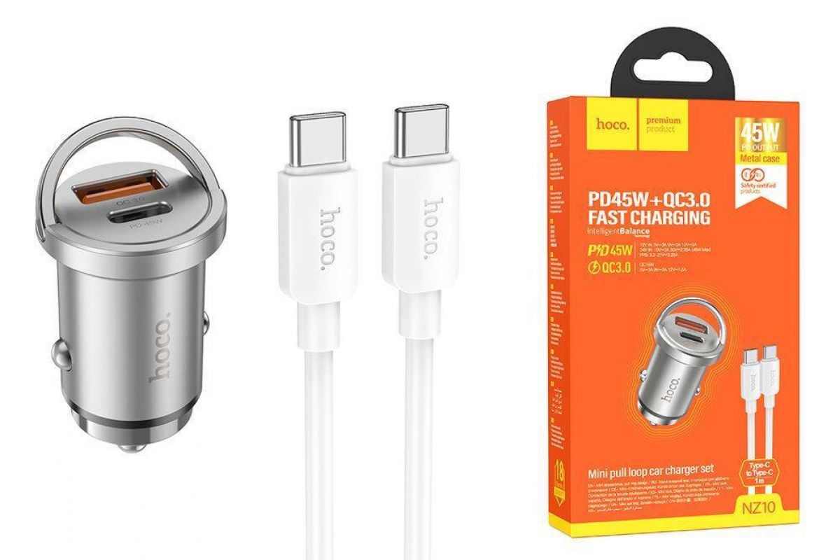 Автомобильное зарядное устройство АЗУ USB + Type-C + кабель Type-C HOCO NZ10 Handy PD45W + QC3.0 (серебристый)