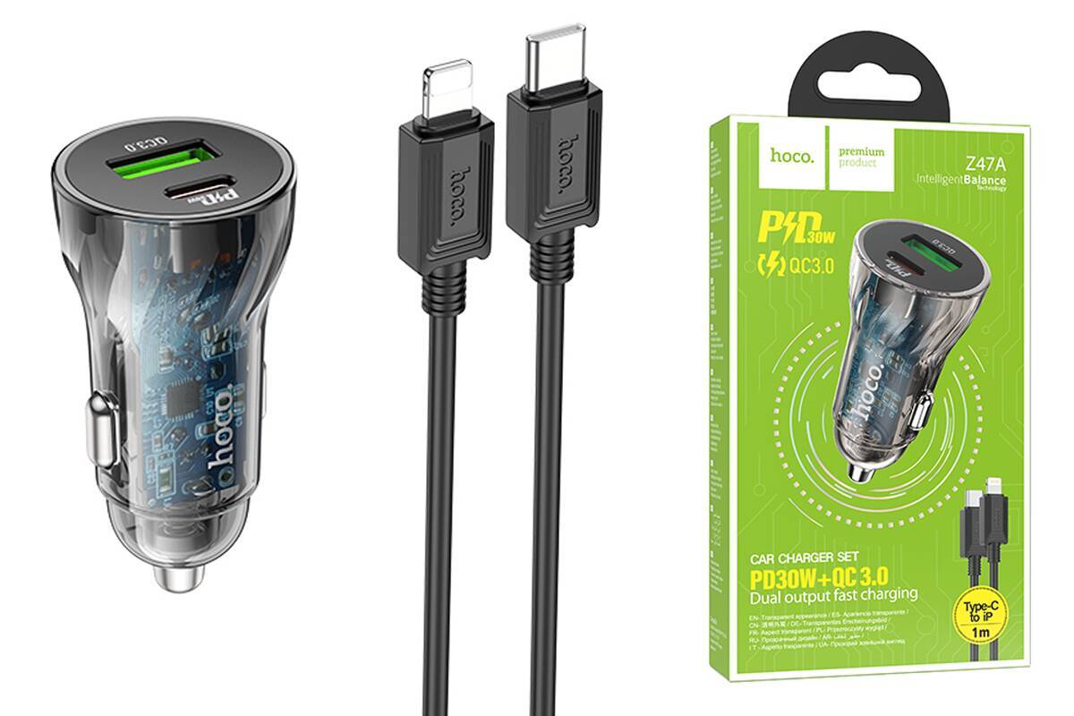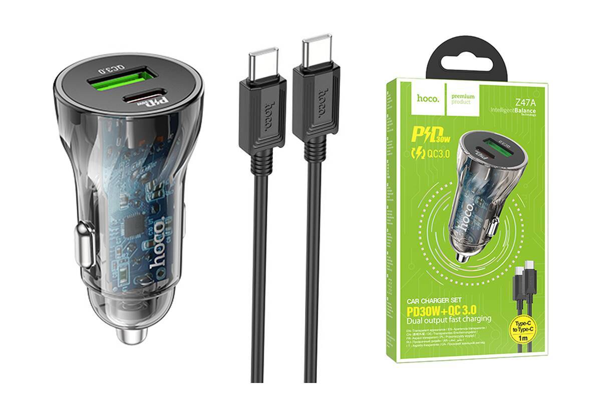 Автомобильное зарядное устройство АЗУ USB + USB-C HOCO Z47A Transperent PD30W+QC3.0 (черный прозрачный)