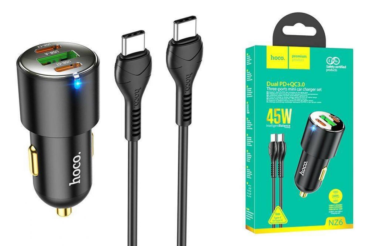Автомобильное зарядное устройство АЗУ USB + 2Type-C + кабель Type-C HOCO NZ6 PD45W + QC3.0 (черный)