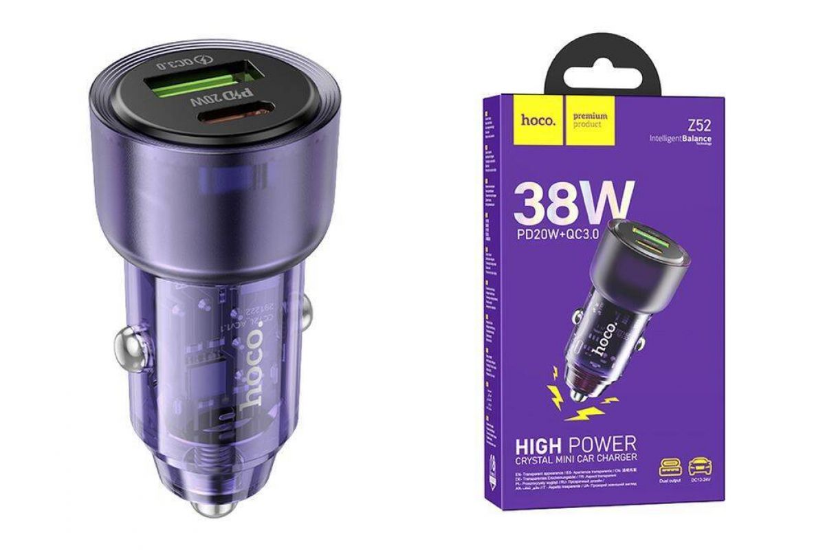 Автомобильное зарядное устройство АЗУ USB + USB-C HOCO Z52 Spacious PD38W+QC3.0 (фиолетовый прозрачный) Автомобильное зарядное устройство АЗУ USB + USB-C HOCO Z52 Spacious PD38W+QC3.0 (фиолетовый прозрачный)