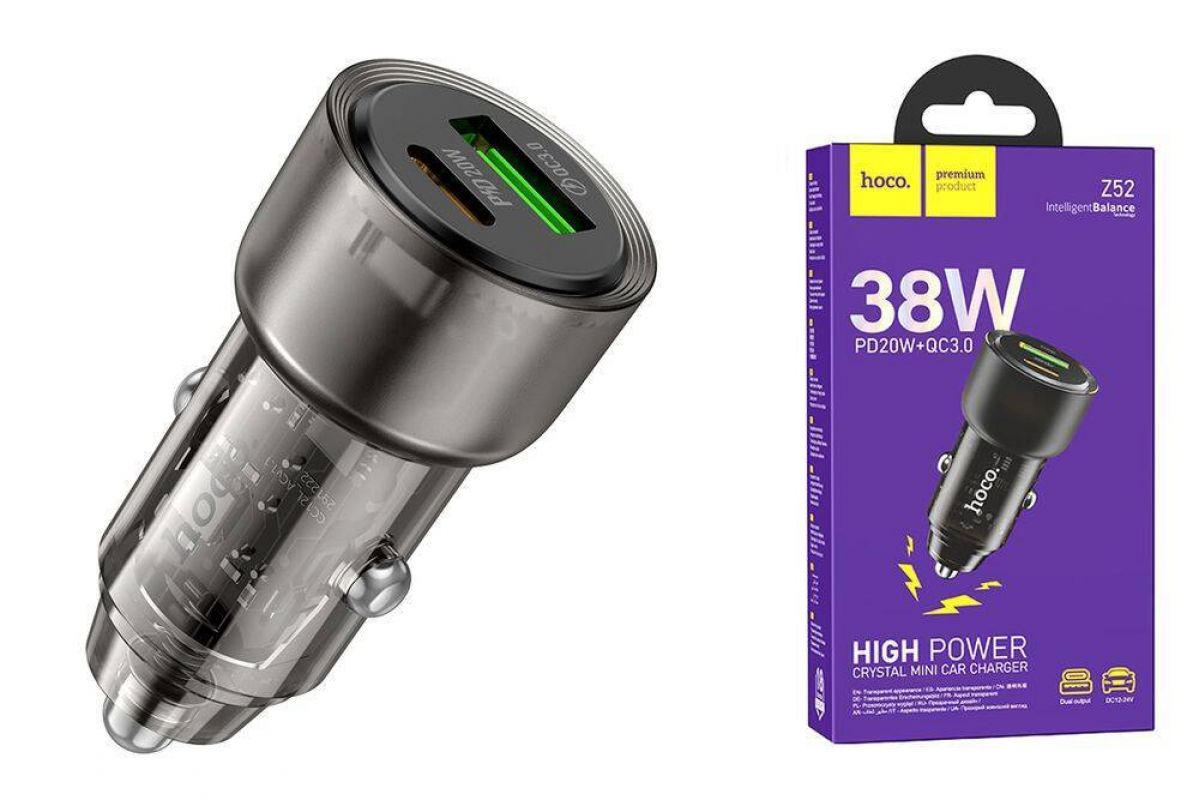 Автомобильное зарядное устройство АЗУ USB + USB-C HOCO Z52 Spacious PD38W+QC3.0 (черный прозрачный)