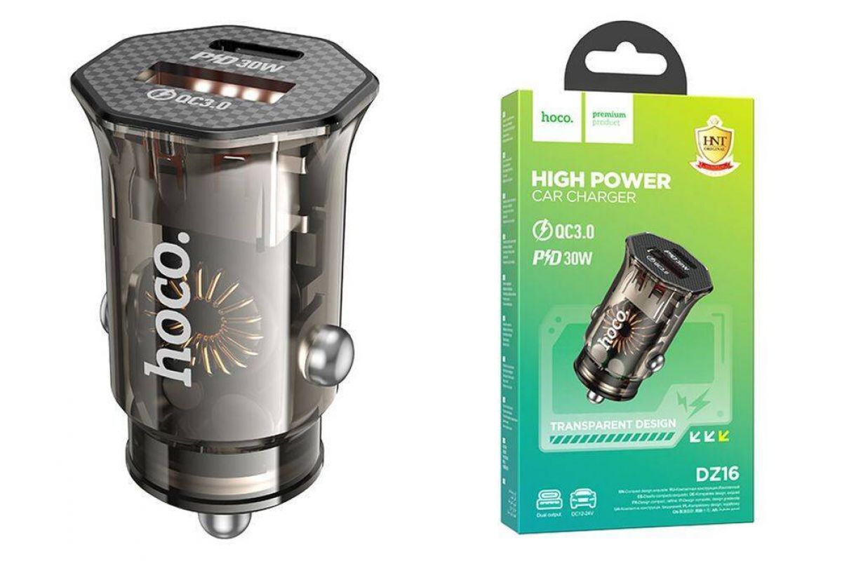 Автомобильное зарядное устройство АЗУ 2USB HOCO DZ16 QC3.0 PD30W (прозрачный)