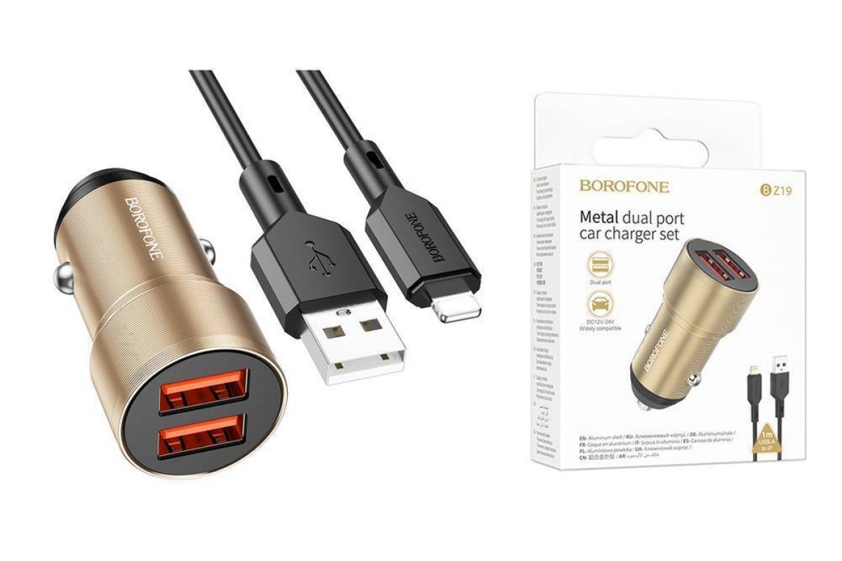 Автомобильное зарядное устройство АЗУ 2USB + кабель Lightning BOROFONE BZ19 Wisdom (золотистое)