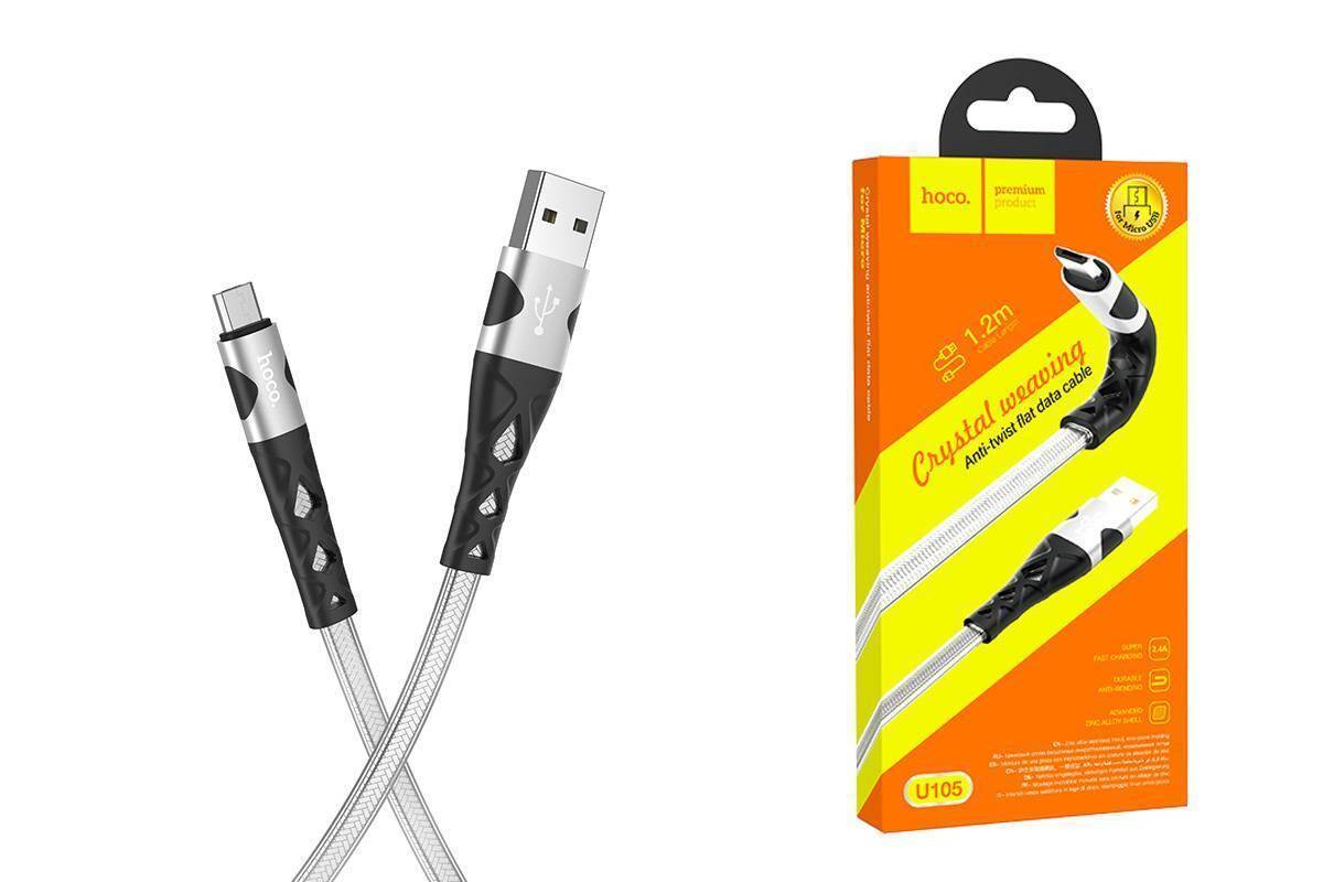 Кабель USB - MicroUSB HOCO U105 3A (серебристый) 1,2м (с усилением сгиба, двойная оплетка)