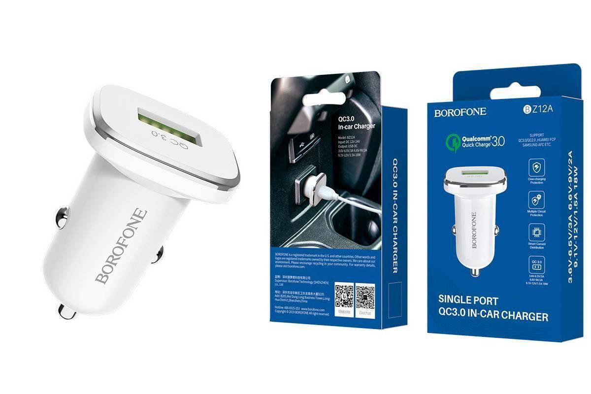 Автомобильное зарядное устройство АЗУ USB BOROFONE BZ12A Listing power single port (один порт)QC3.0 (белый)