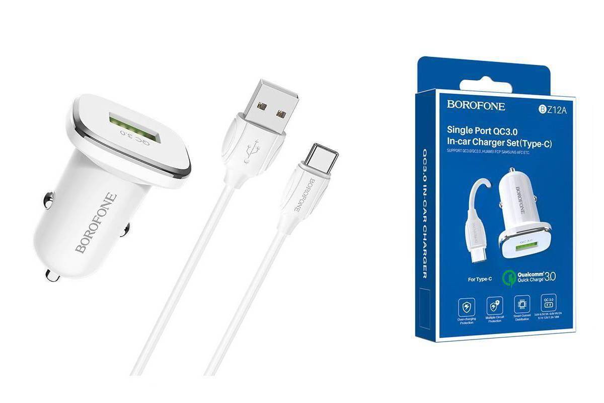 Автомобильное зарядное устройство АЗУ USB + кабель Type-C BOROFONE BZ12A Lasting power port QC 3.0 (белый)