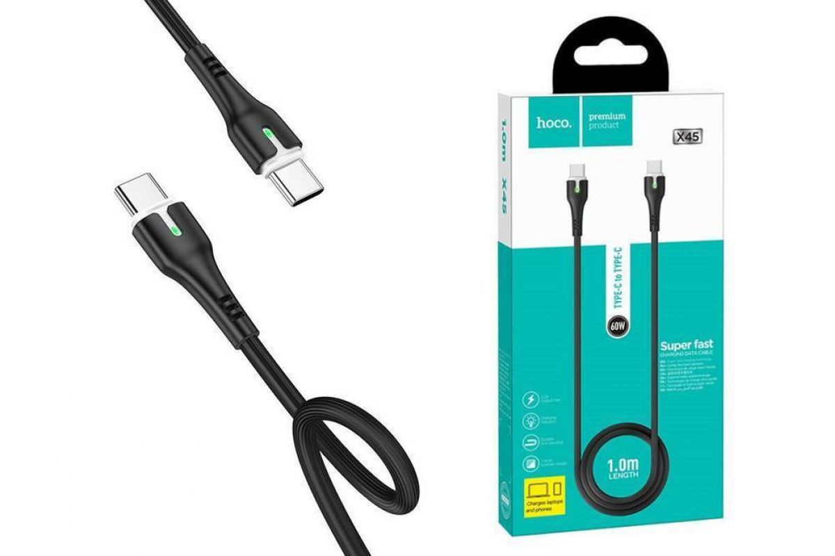 Кабель USB Type-C - USB Type-C HOCO X45, 3A PD60W (черный) 1м (LED индикатор)
